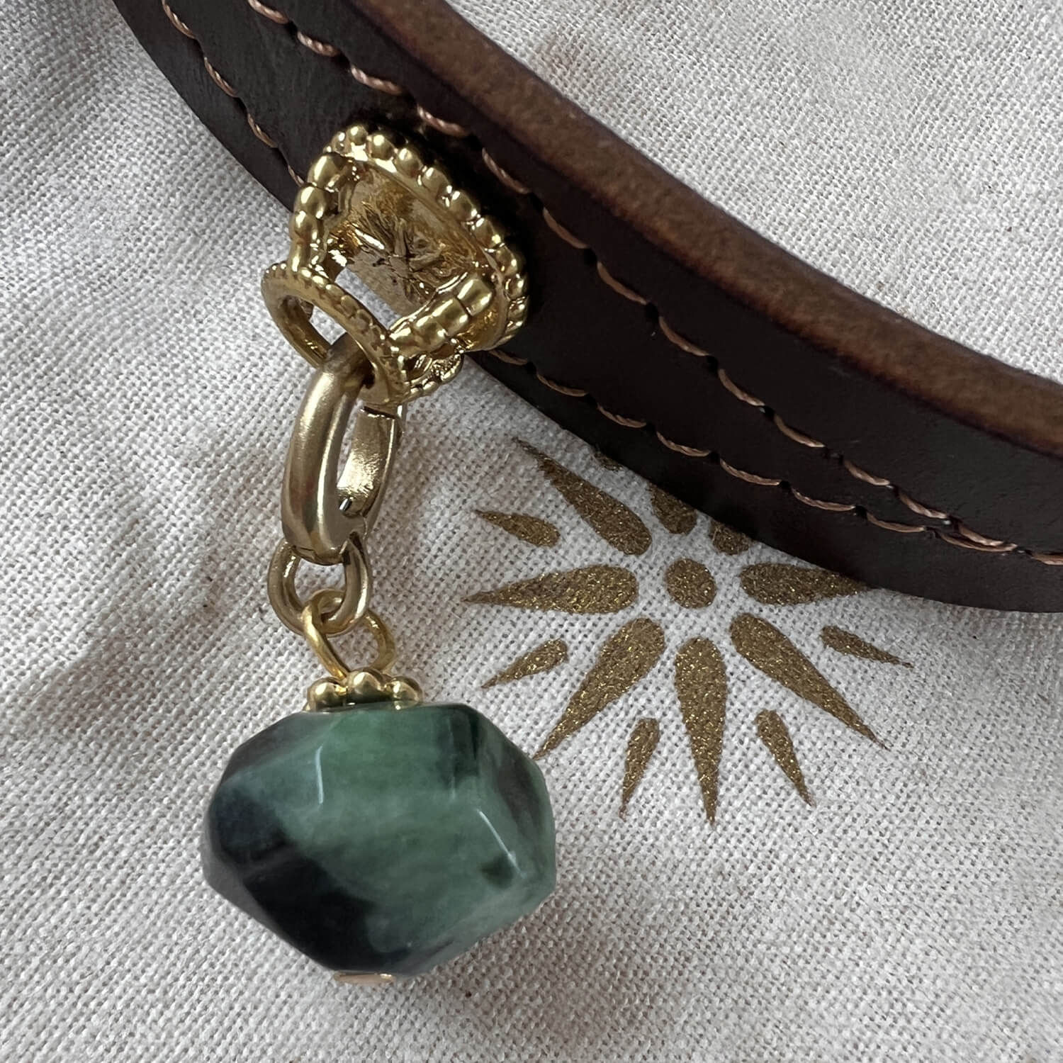 This charm can be worn on any collar from our dog collection. Our charms are made with our playful friends in mind: they’re noiseless and don’t bother any dog more than a dog tag, and allow for worry-free play due to our clip design; they will not get caught on branches.