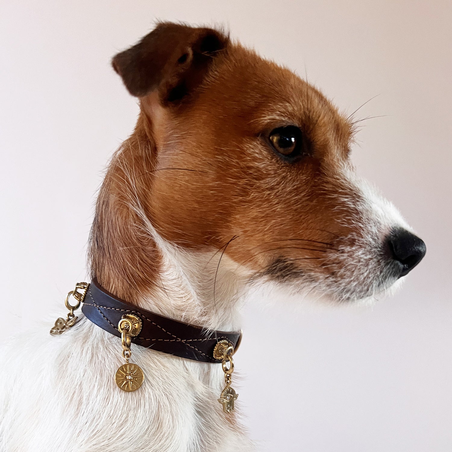 This charm can be worn on any collar from our dog collection. Our charms are made with our playful friends in mind: they’re noiseless and don’t bother any dog more than a dog tag, and allow for worry-free play due to our clip design; they will not get caught on branches.