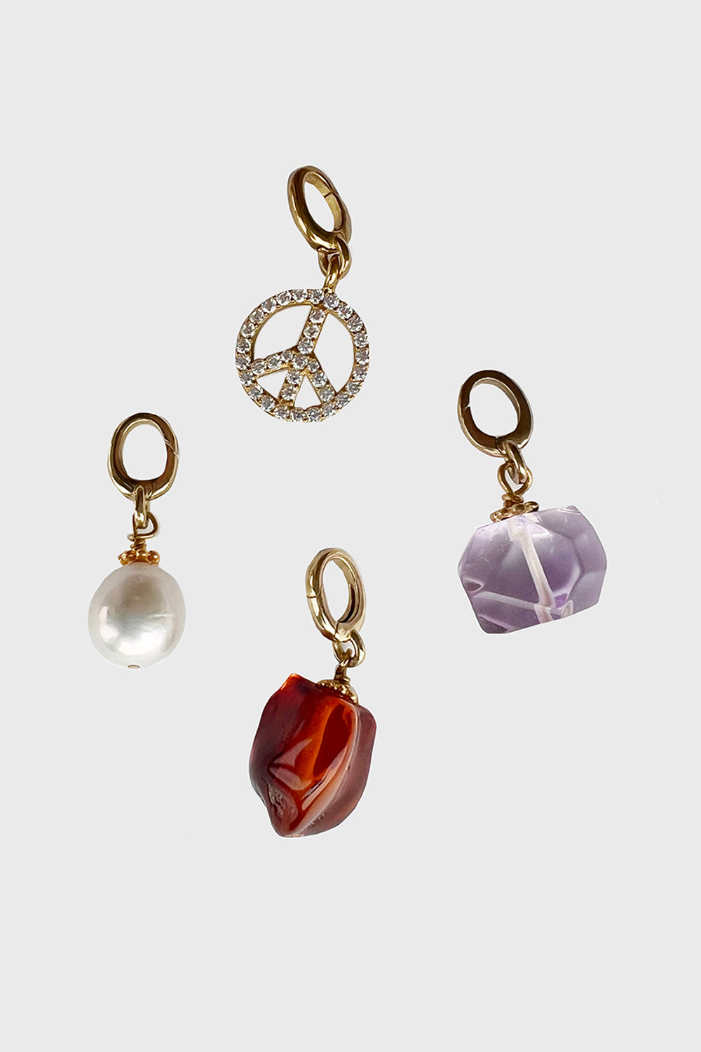 The Tranquil Soul combination in medium includes a base dog collar in natural leather which is adorned with a Harmony charm, a Balance charm, a Calm charm and a Peace charm.