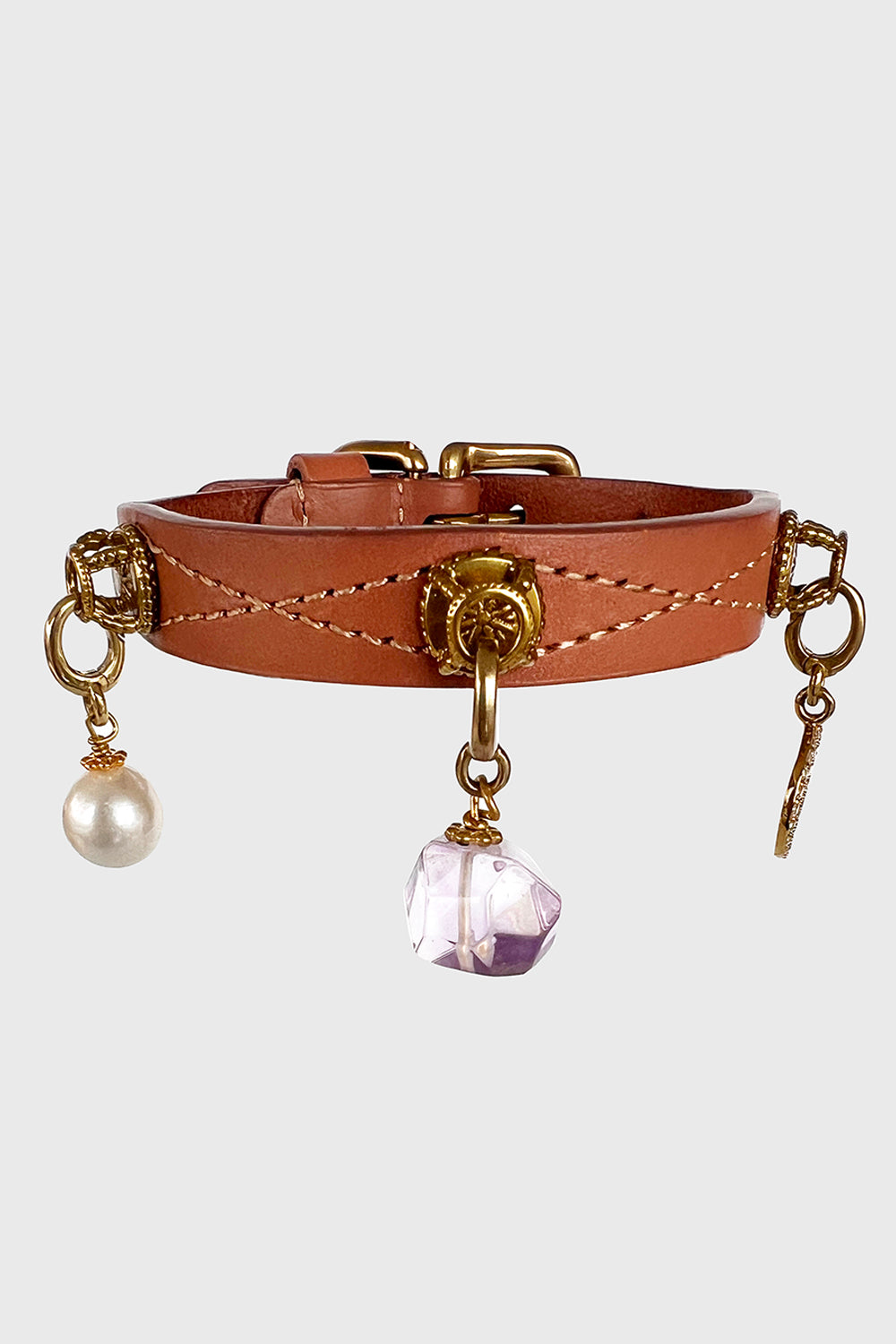 The Tranquil Soul combination in x-small includes a base dog collar in natural leather which is adorned with a Balance charm, a Calm charm and a Peace charm.
