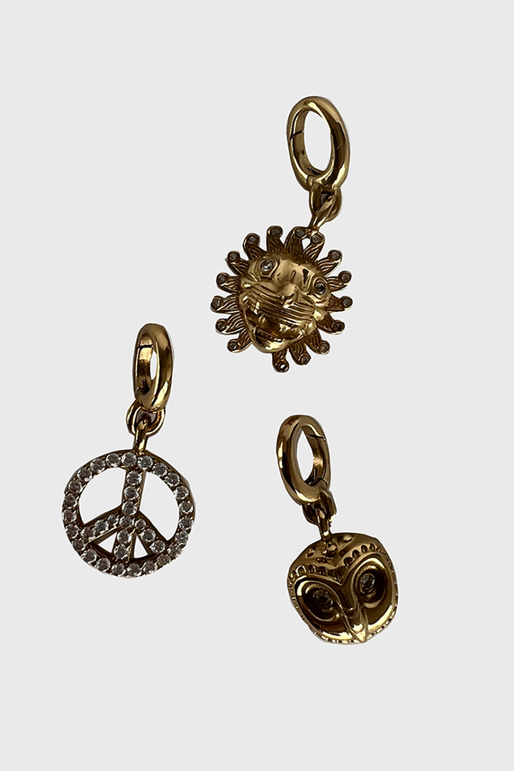 The Untamed Spirit combination in x-small includes a base dog collar in cognac leather which is adorned with a Courage charm, an Independant charm and a Peace charm.