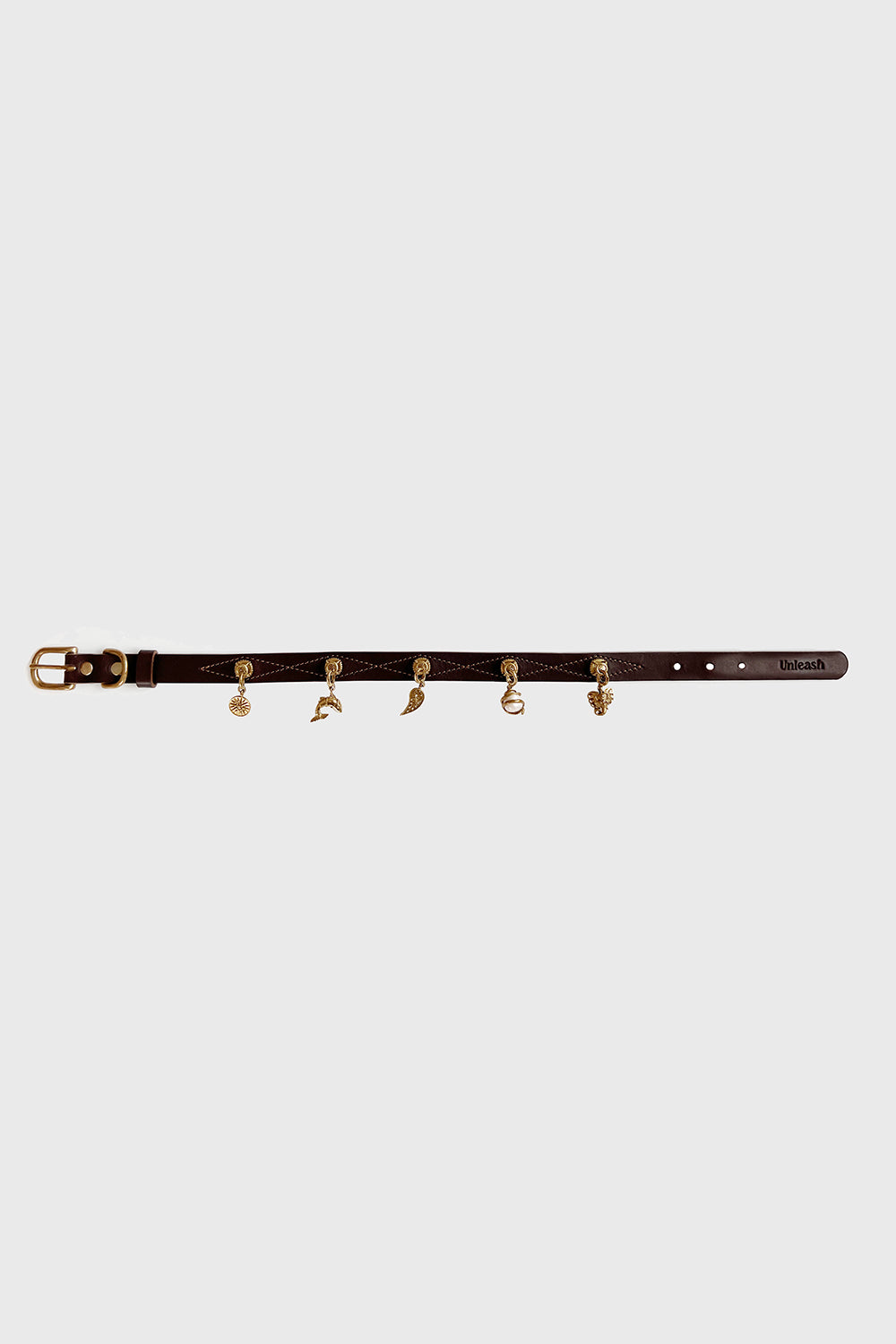 The Blooming Soul combination in large includes a base dog collar in dark brown leather which is adorned with, an Unleash charm, a Depth charm, a Relief charm, a Transformation charm and a Wisdom charm.