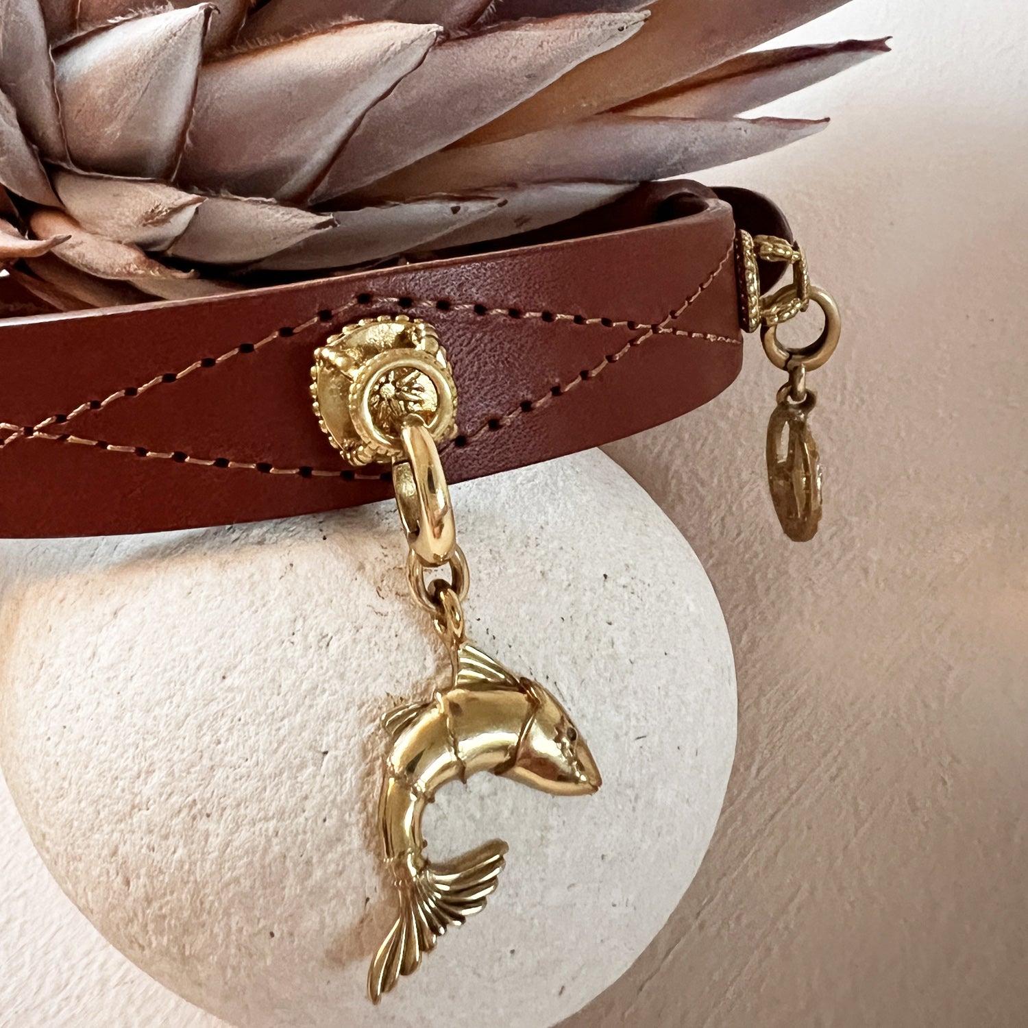 This charm can be worn on any collar from our dog collection. Our charms are made with our playful friends in mind: they’re noiseless and don’t bother any dog more than a dog tag, and allow for worry-free play due to our clip design; they will not get caught on branches.