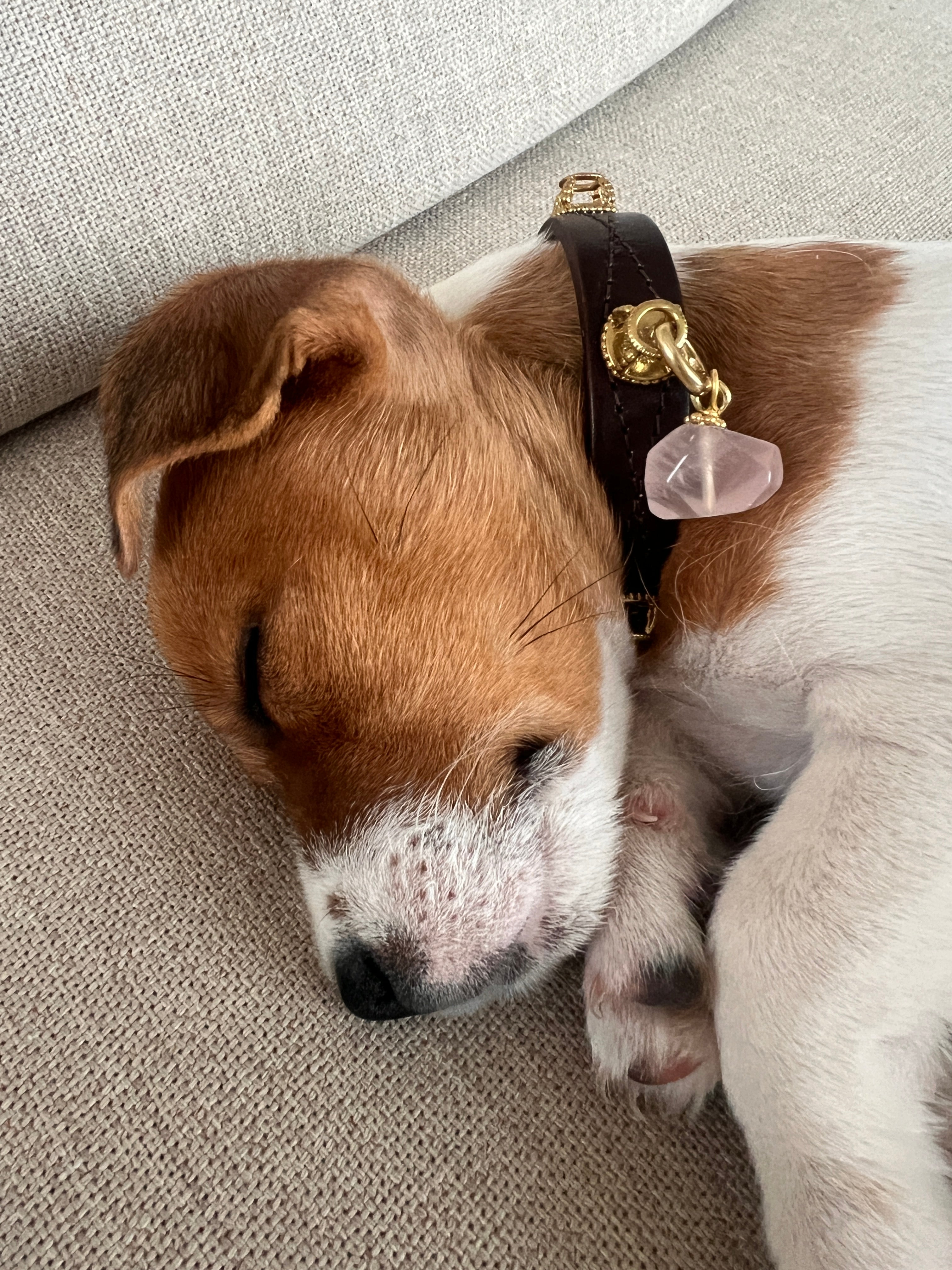 This charm can be worn on any collar from our dog collection. Our charms are made with our playful friends in mind: they’re noiseless and don’t bother any dog more than a dog tag, and allow for worry-free play due to our clip design; they will not get caught on branches.
