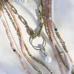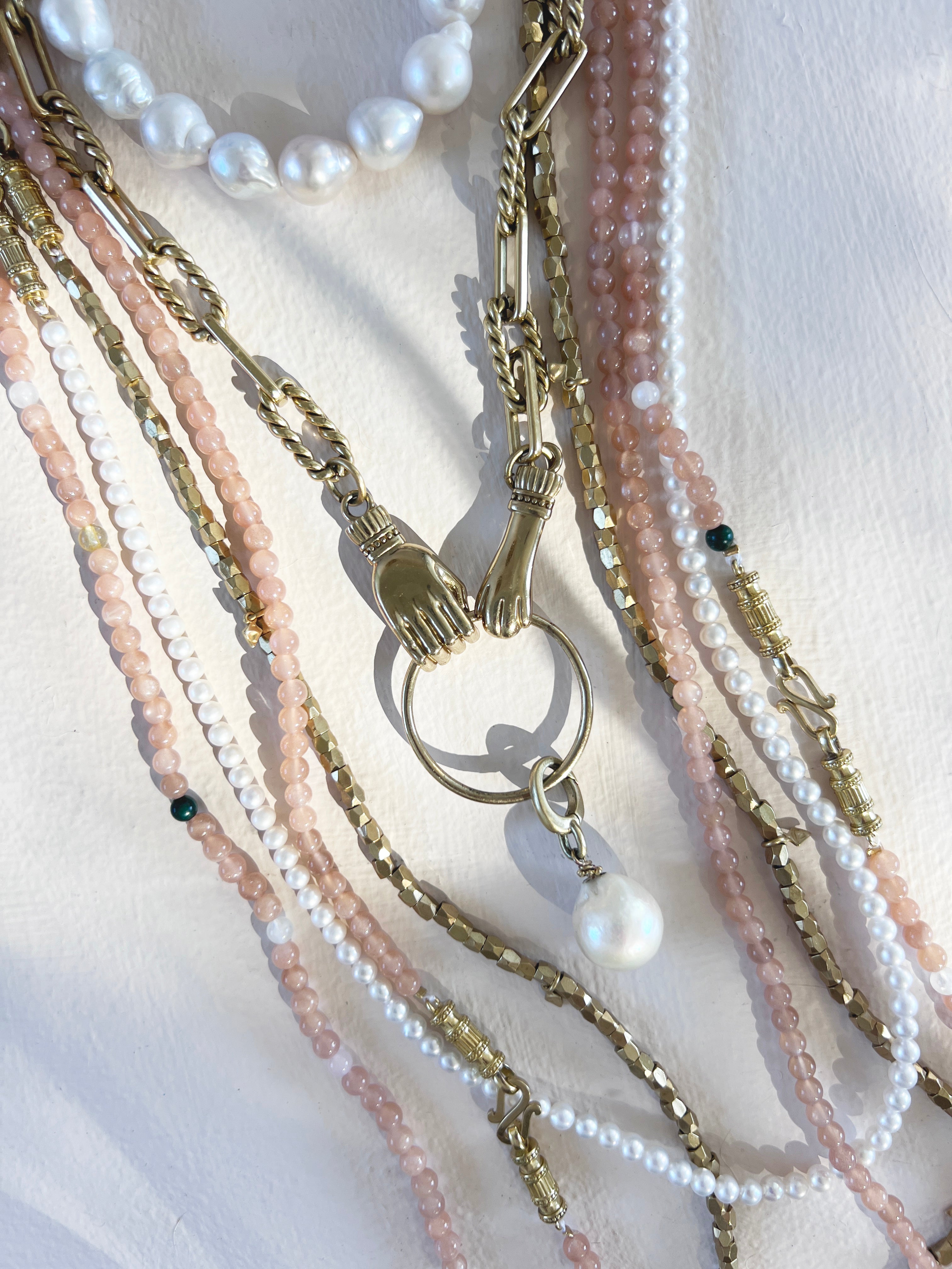 Our chains are created from genuine and beautiful crystal beads, freshwater pearls, and polished brass beads, all featuring the unique Unleash Cph clasp.
